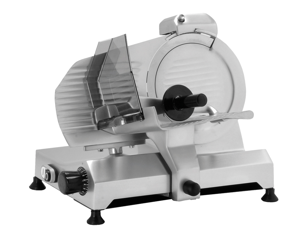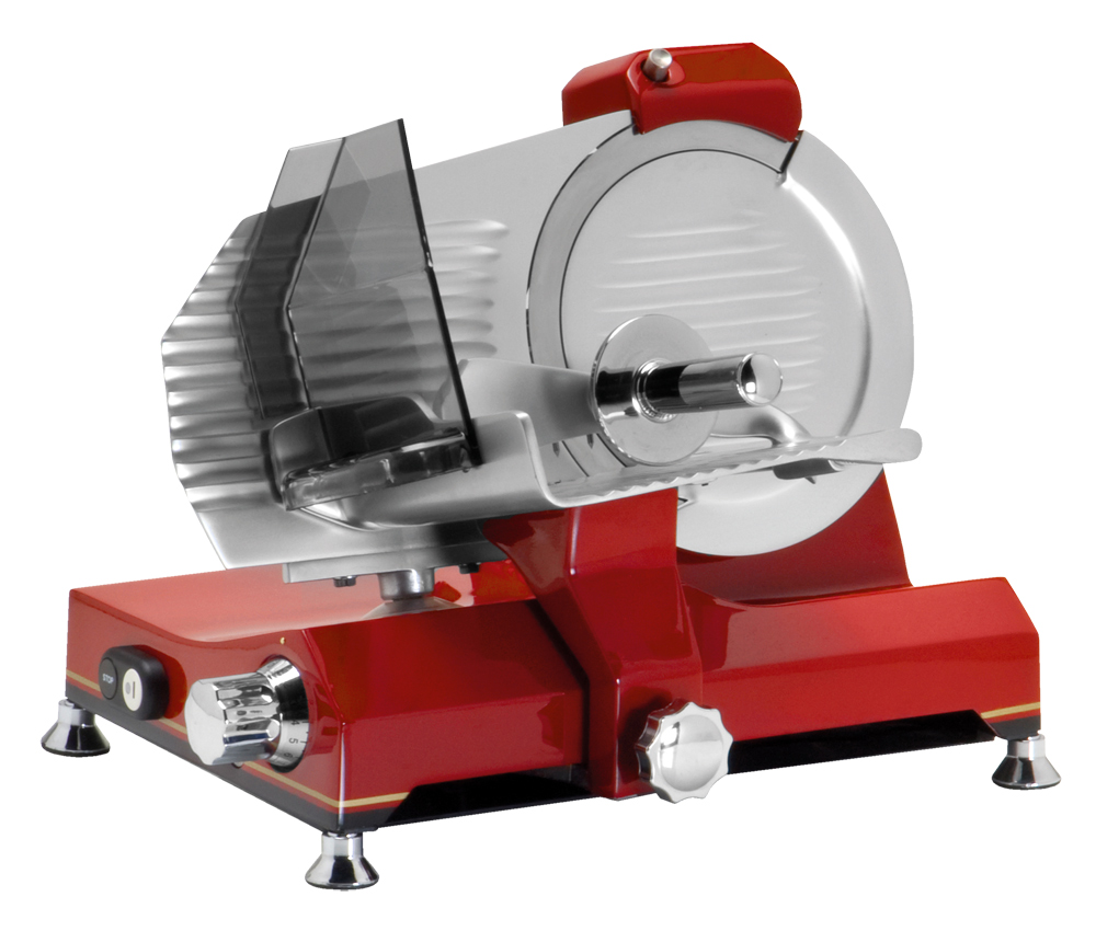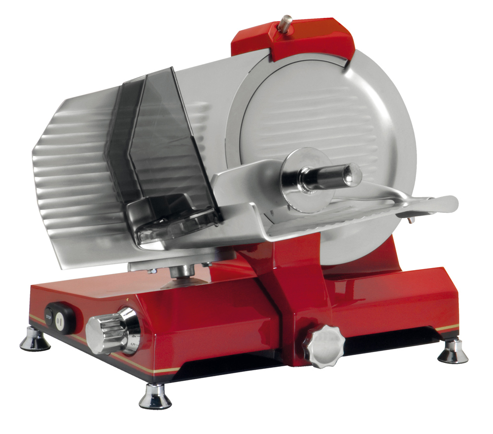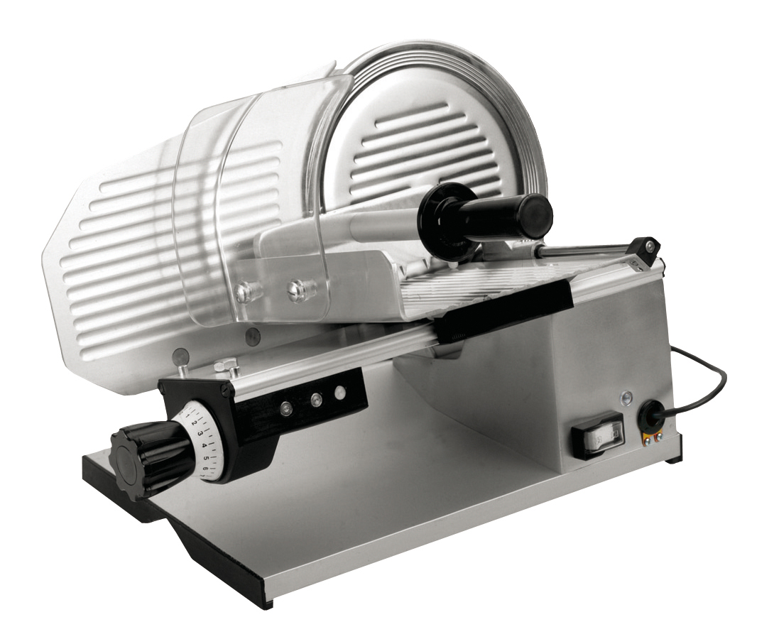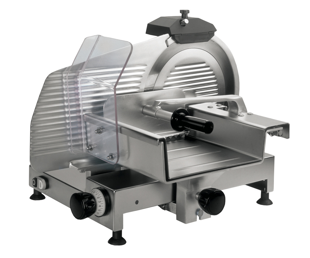 Mit einer patentierten, rostfreien und lebensmittelechten Oberfläche. Die Maschinen haben einen 12V Schalter mit Feststelleinrichtung. Der Schlitten hat einen Spezialarm für Würste und einen doppelten Wagen für Fleisch. Der Schlitten läuft auf einem Lager mit einer ausgerichteten festsitzenden Stange.