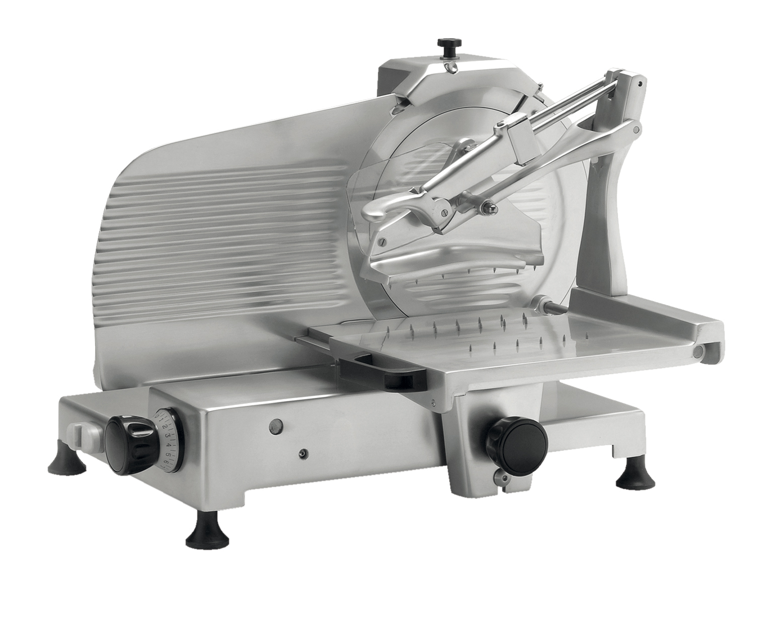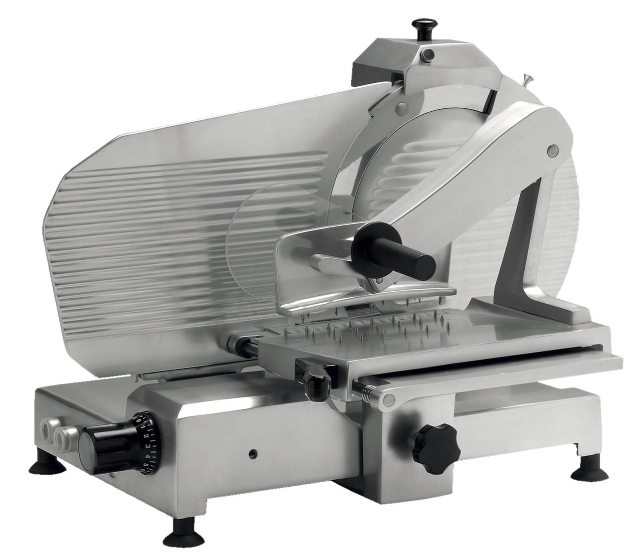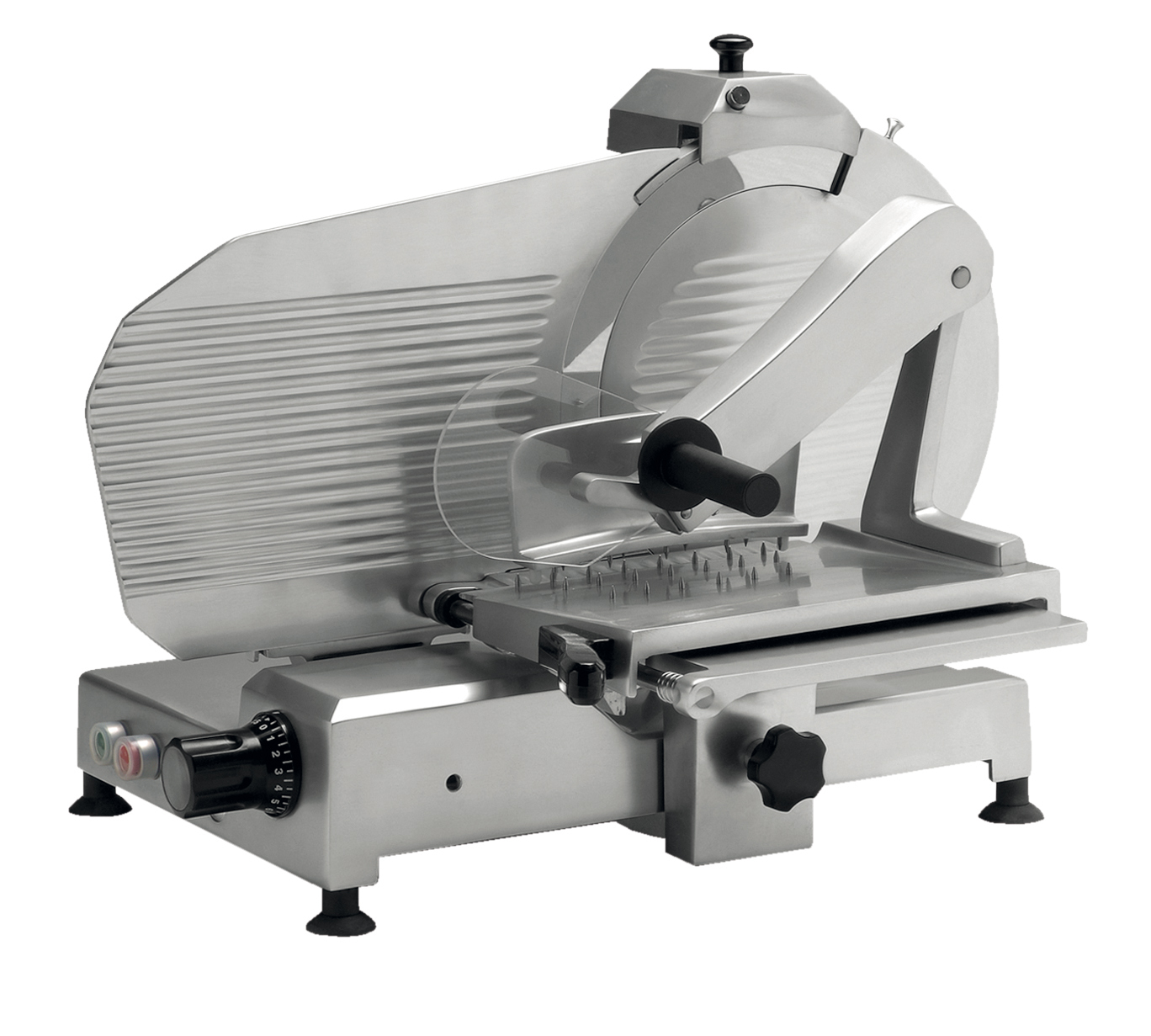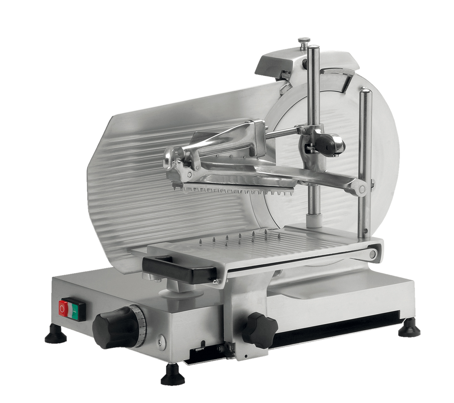 Mit einer patentierten, rostfreien und lebensmittelechten Oberfläche. Die Maschinen haben einen 12V Schalter mit Feststelleinrichtung. Der Schlitten hat einen Spezialarm für Würste und einen doppelten Wagen für Fleisch. Der Schlitten läuft auf einem Lager mit einer ausgerichteten festsitzenden Stange.