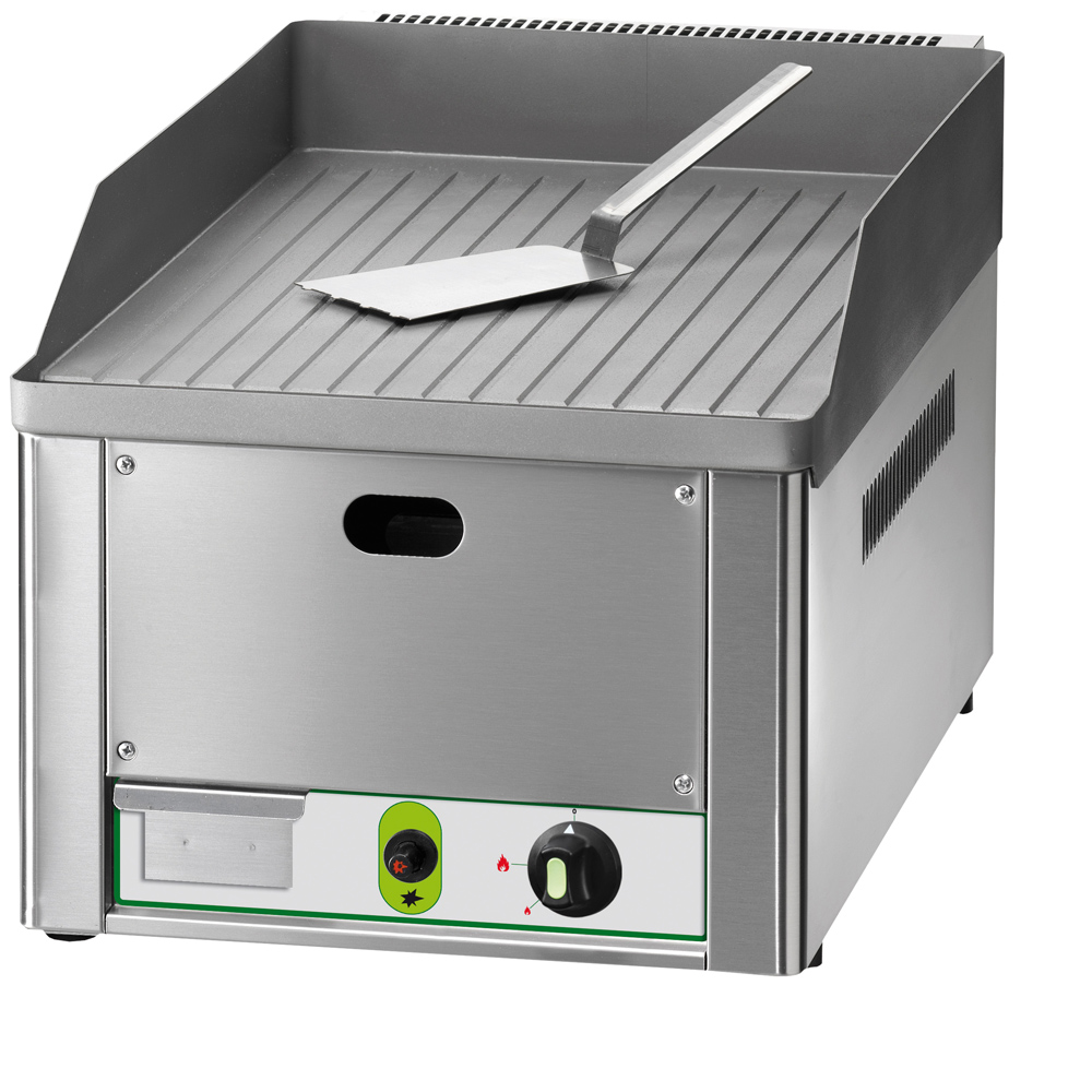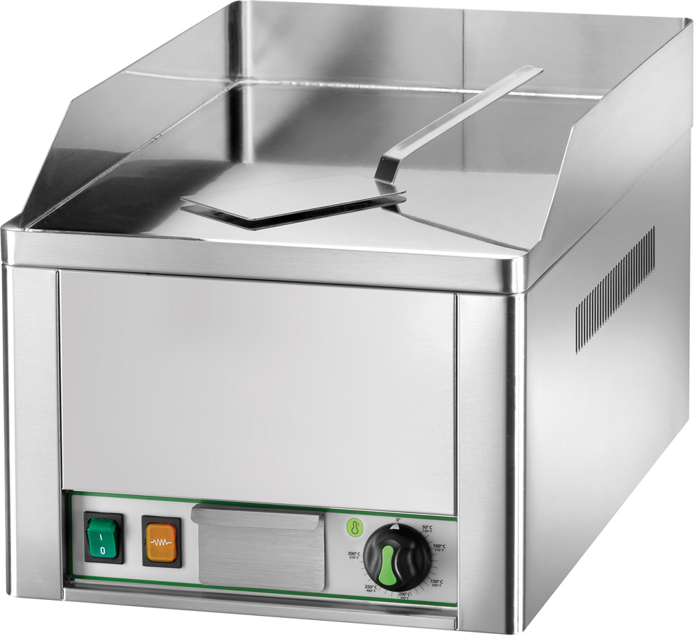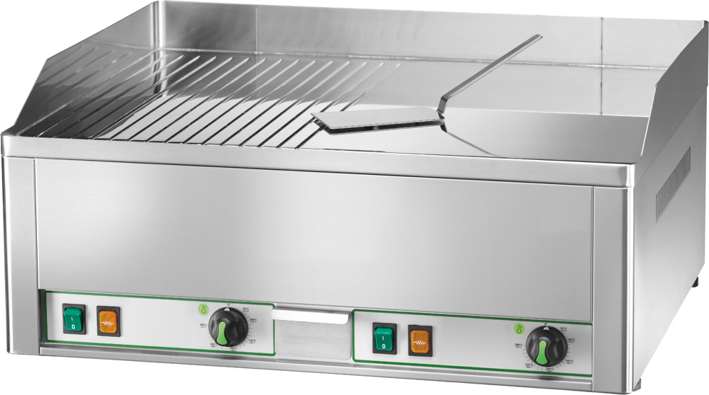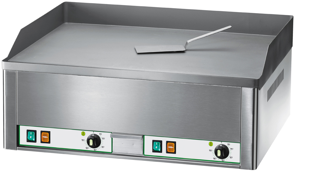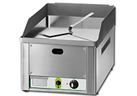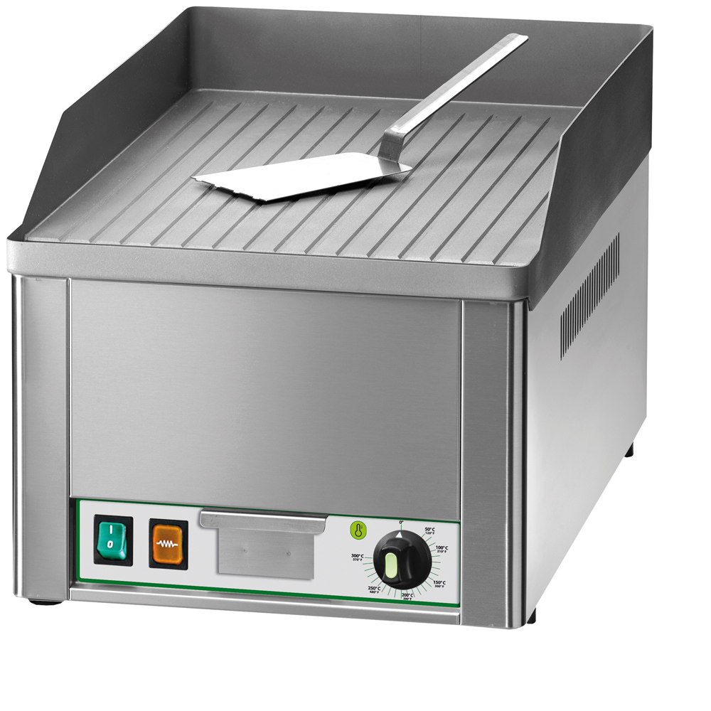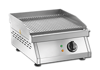 Mit verschiedenen Bratflächen erhältlich: in glattem Stahl (L), glattem Chromstahl (LC), gerilltem Stahl (R), gerilltem Chromstahl (RC), oder beides kombiniert. Thermostat 0-300°C.