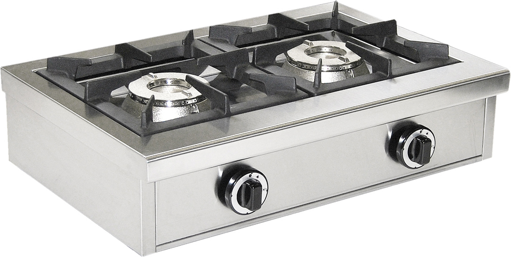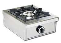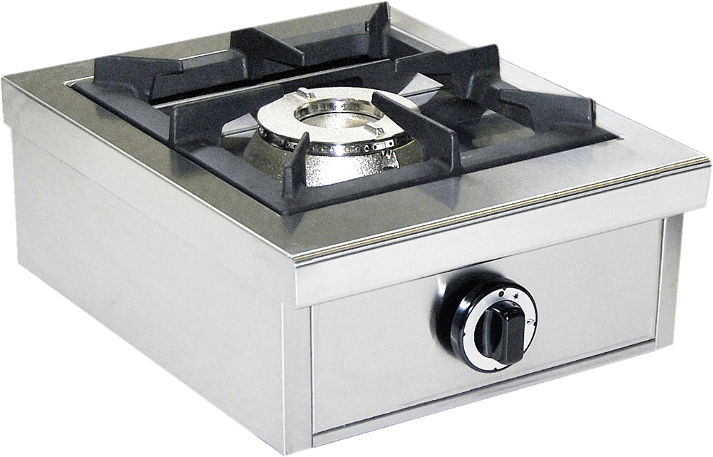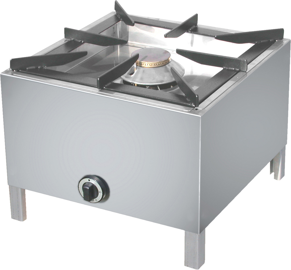 Elektro-Herdplatten und Gasbrenner in verschiedenen Ausführungen. Der Hockerkocher FRG 11 ist aus Edelstahl mit Zündsicherung hergestellt. Der Gussrippenrahmen ist schwarz emailiert.