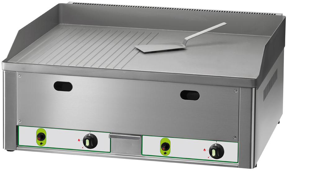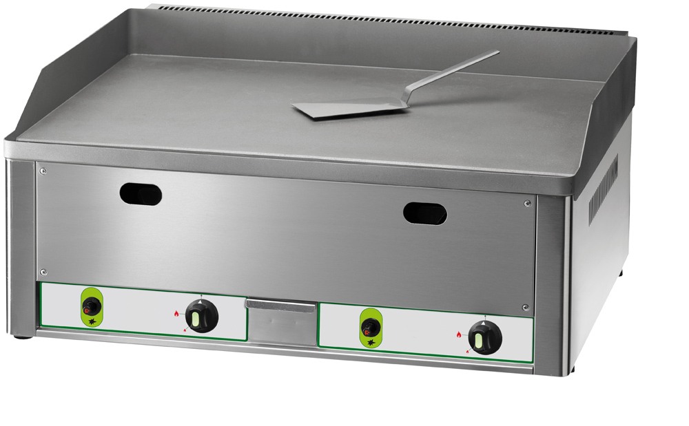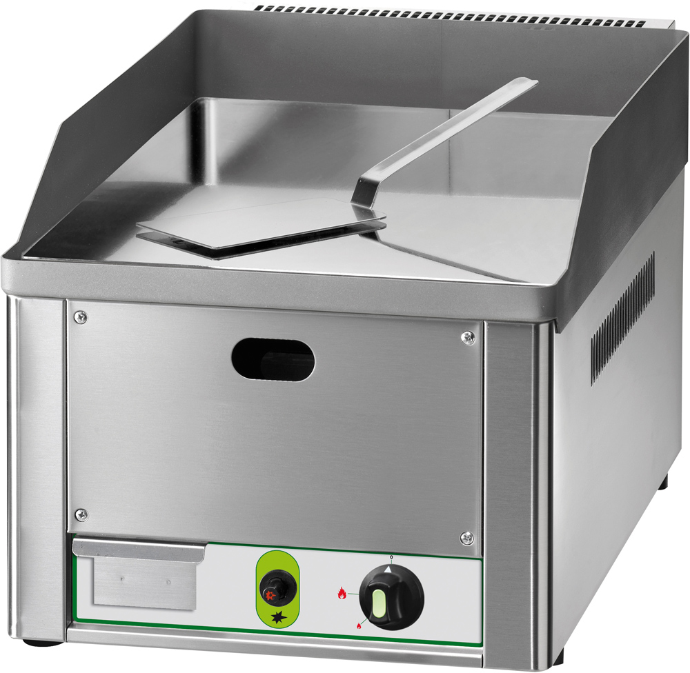 Eine günstige Alternative zu Kochserien Bratplatten. Bratflächen mit glattem Stahl (L), glattem Chromstahl (LC), gerilltem Stahl (R), gerilltem Chromstahl (RC) oder beides kombiniert. erhältlich. Pfannenwender aus Edelstahl bei FRY-Modellen inklusive.