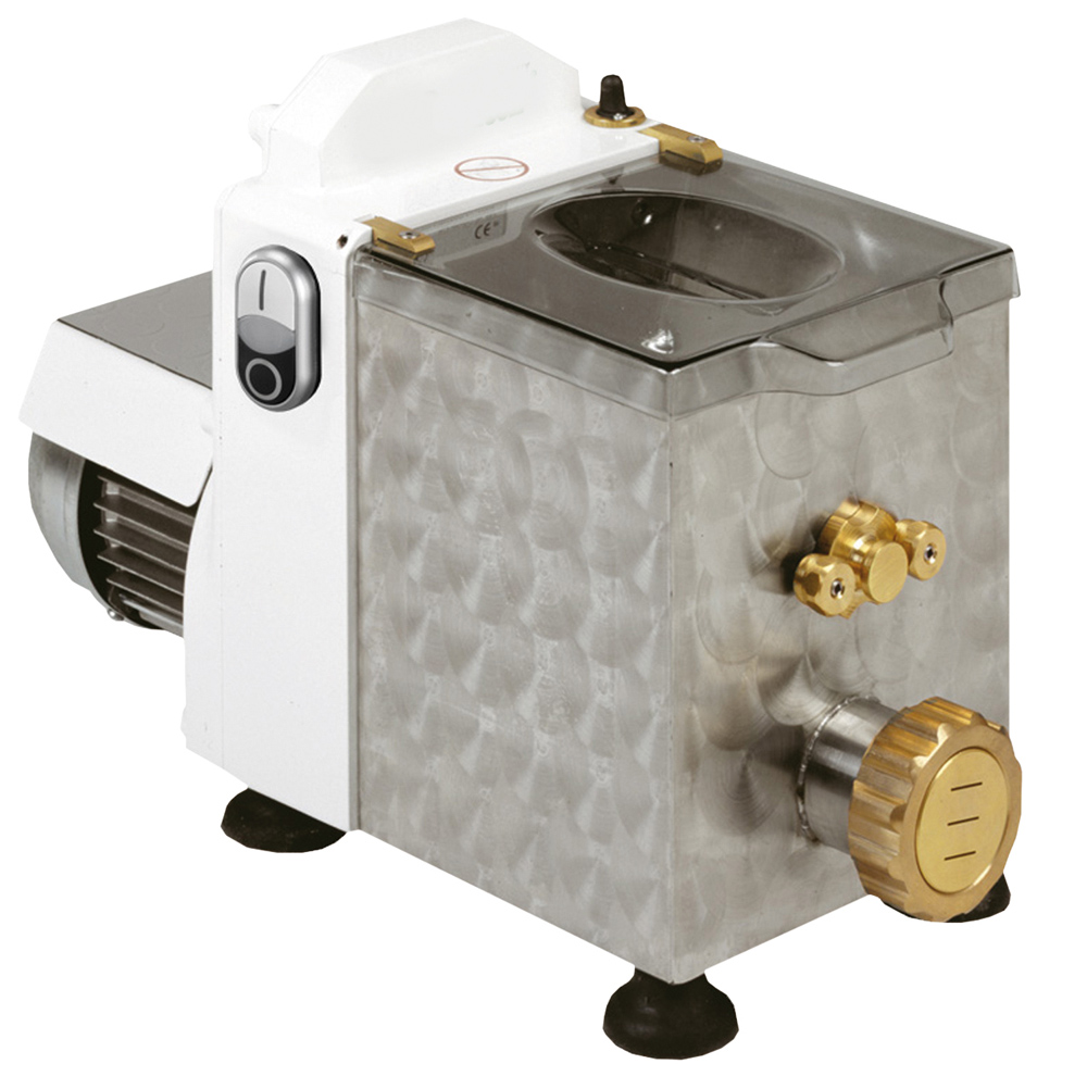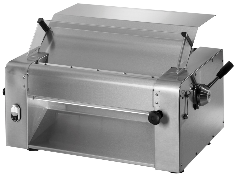 Dieser Teigausroller wird vorzugsweise als Nudelteigausroller benutzt. Mit optionalen Messern in verschiedenen Größen werden die Nudeln auch gleich in der gewünschten Breite geschnitten. Äußerst praktische und vielseitig einsetzbare Maschine für kleinere bis größere Küchen.