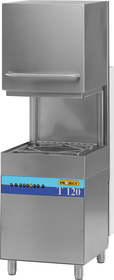 Vollautomatische Spülmaschinen. Frontaler Zugriff auf alle Bestandteile. Ein Sicherheitsmikroschalter hält den Waschvorgang an, wenn die Türe geöffnet wird. Leistung: 30 Körbe pro Stunde, Laugenpumpe: 20 Liter/min.